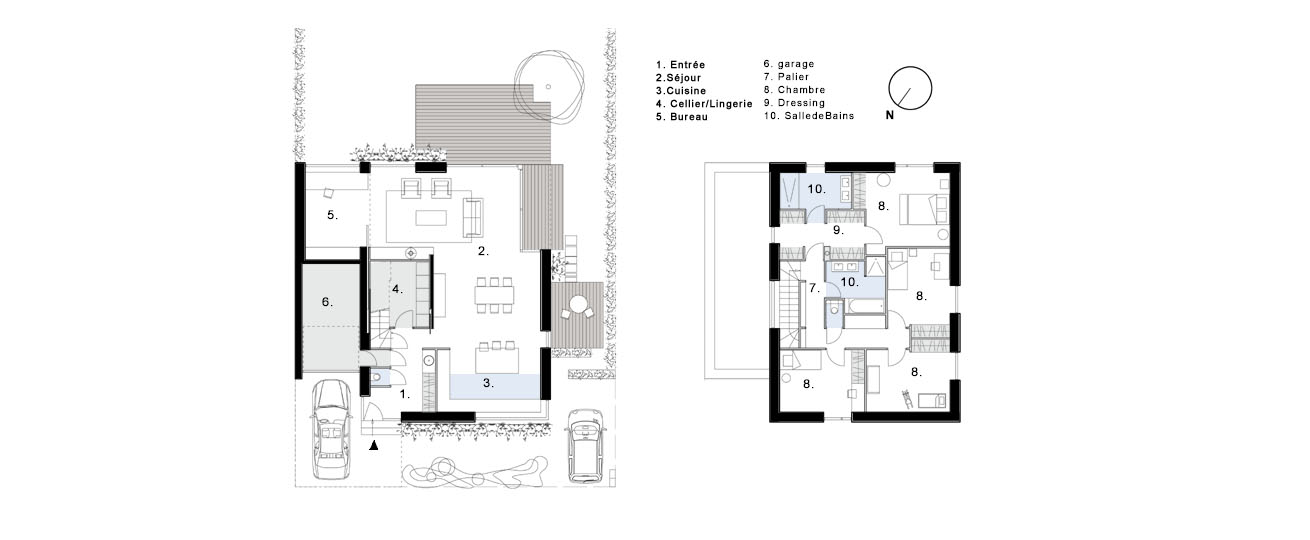 Pour le lot J, l’ossature bois a été retenue pour ses vertus écologiques et de rapidité de chantier. Alors que l’entrée et la cuisine occupent l’espace avant, la vue sur le jardin et la campagne mouvalloise est laissée au salon et à la salle à manger. De grandes et larges baies inondent les pièces à vivre de lumière et de soleil tout en étant protégé de la sur chauffe par le débord du volume de l’étage. En façade avant, un angle totalement vitré marque l’entrée alors qu’un bandeau horizontal souligne le plan de travail de la cuisine tout en préservant l’intimité intérieure.
