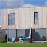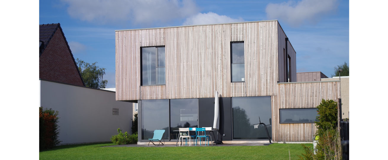 Type de construction : ossature bois, Bardage : mélèze ajouré et Arpa noir, menuiserie aluminium laqué
