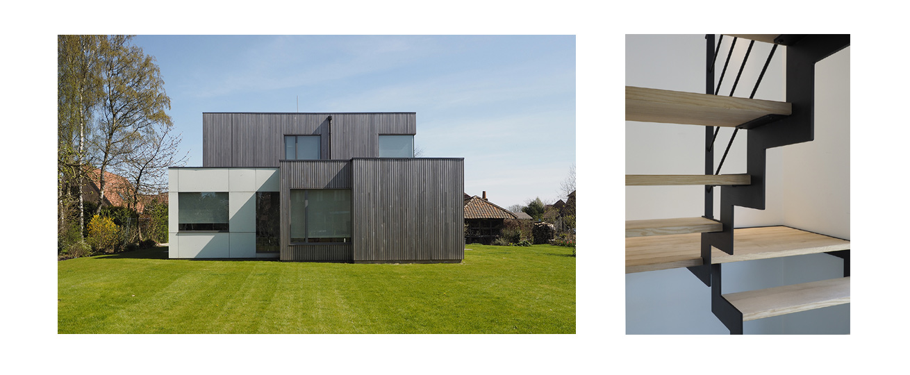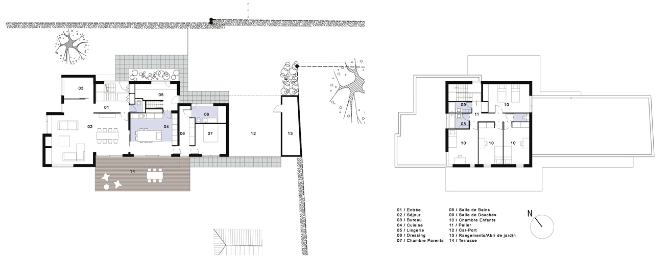 Le bâtiment s'implante en longueur pour augmenter la surface de façade au sud et en décalage avec l'allée d'accès afin de dissimuler la maison depuis le chemin d’accès. Il se décompose en une série de volumes simples. Le volume central est serti de volume bas volontairement allongés et étirés afin de créer une composition d'ensemble homogène et élégante.