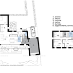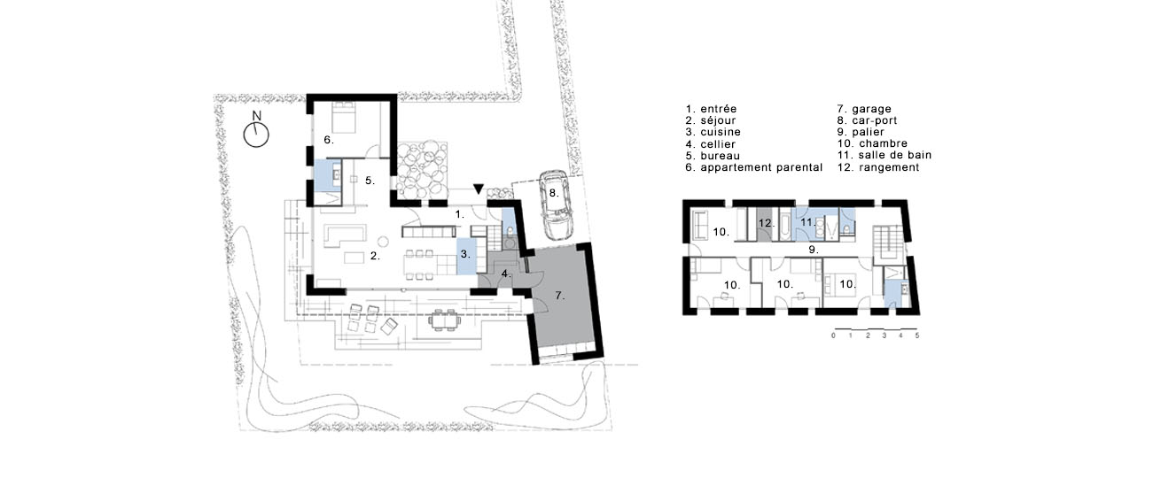 Un volume principal sur 2 niveaux abrite les pièces à vivre au rez-de-chaussée et les 4 chambres d’enfants à l’étage. 2 volumes bas (garage-pièce technique et appartement parental) amarrent la maison aux limites et délimitent ainsi une zone pavée d’accueil et stationnement sur l’avant et le jardin clos orienté plein Sud.