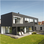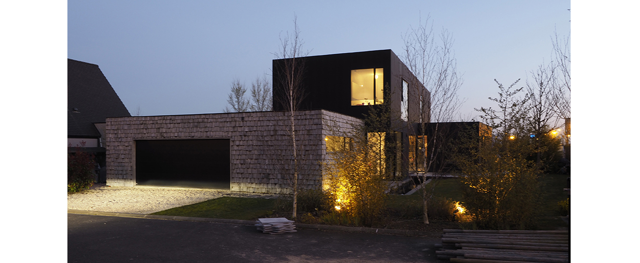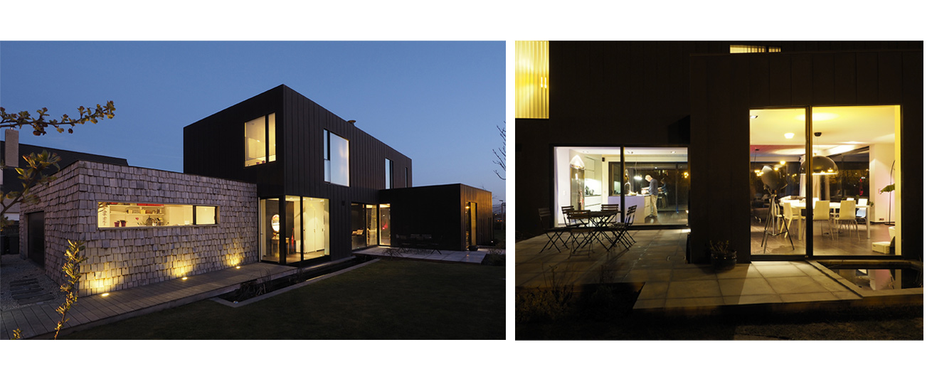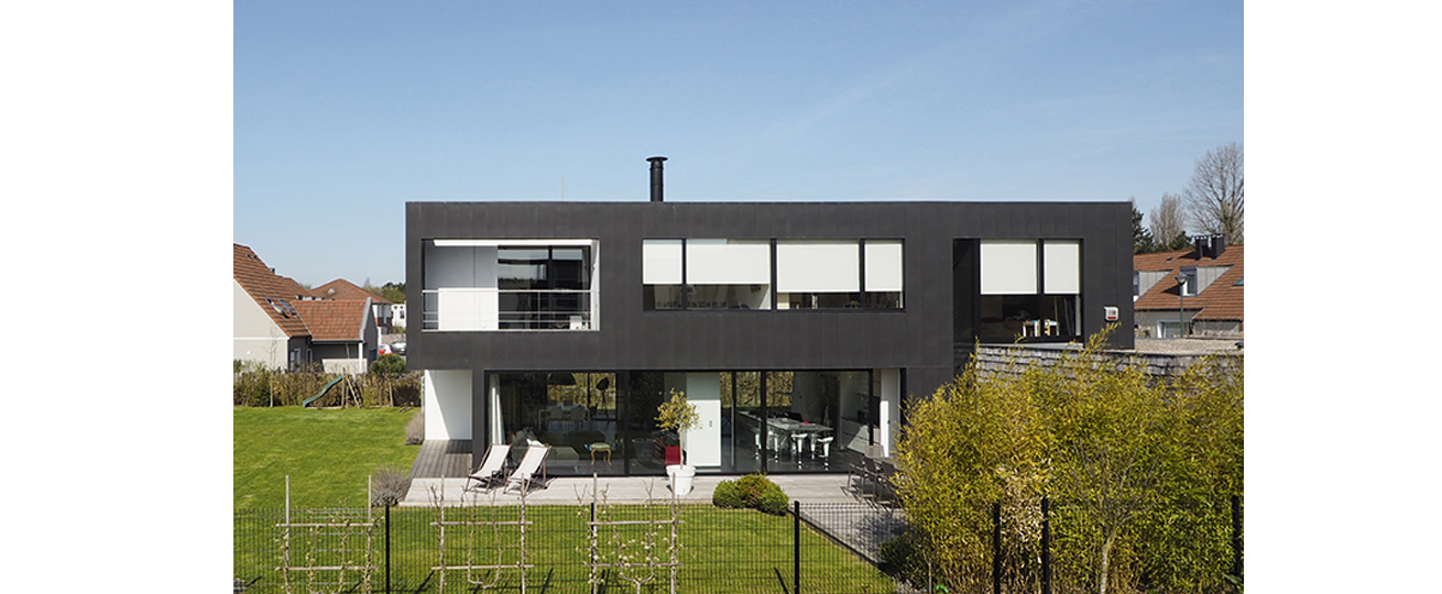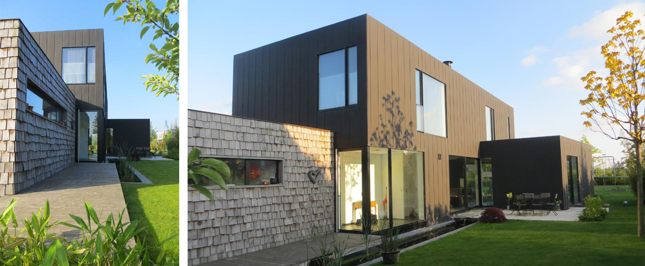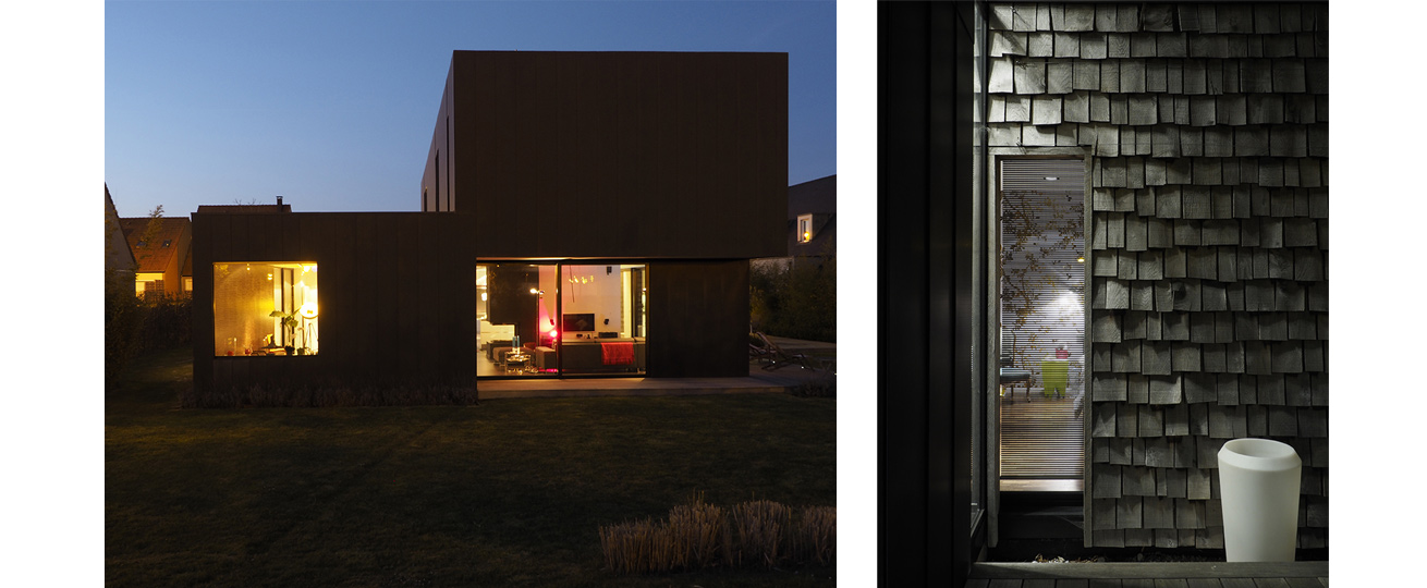 Les matériaux constituant la maison ont été choisis pour leur performance et leur pérennité. Les façades sont recouvertes d’un bardage en zinc à pose agrafée ou de bardeaux en chêne massif brut (issu de parties de dosses inexploitables par les scieries). Les toitures terrasses sont étanchées par de la membrane PVC.Toutes les menuiseries sont en aluminium laquée. L’ensemble des matériaux constituant l’enveloppe ne nécessite aucun entretien et présente des durées de vie supérieures à 50 ans.