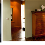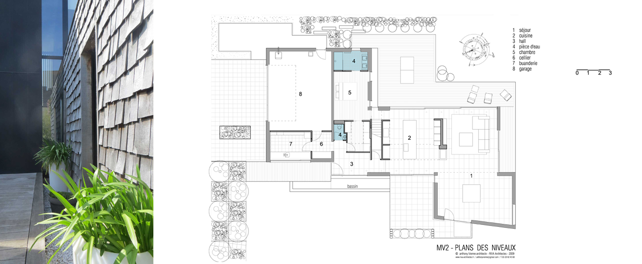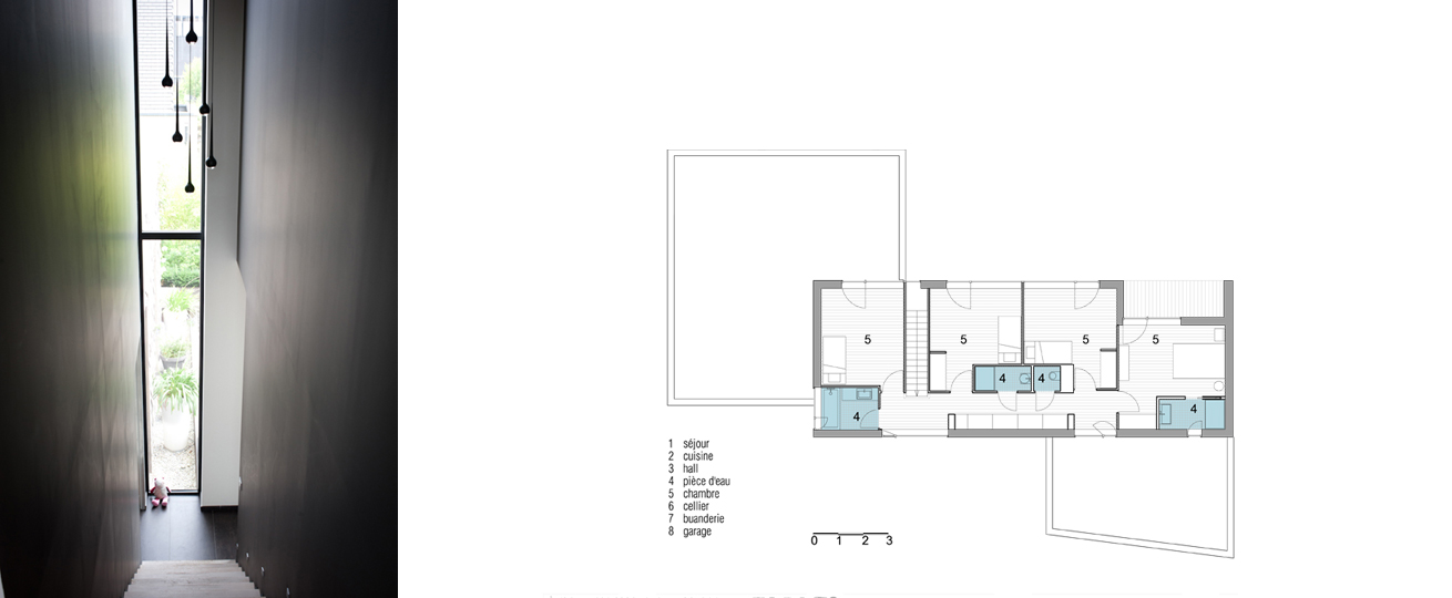 Le projet présente ainsi un séjour au rez-de-chaussée en triple orientation : Est / Sud / Ouest, préservé des vis-à-vis par un aménagement paysager pensé avec le projet : haies périphériques pour les vis-à-vis proches, bosquets d’arbustes ou arbres de haute tige pour les vis-à-vis lointains ou plus hauts. A l’étage, les pièces de nuit s’orientent plein Est, tournées vers les jardins voisins tandis que la circulation, qui les dessert, s’éclaire naturellement à l’Ouest par deux grandes baies vitrées à ses extrémités. L’étage est ainsi volontairement aveugle au Nord pour des raisons thermique et au Sud pour un problème de vue sur le centre commercial visible de l’étage en contre bas du terrain.