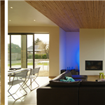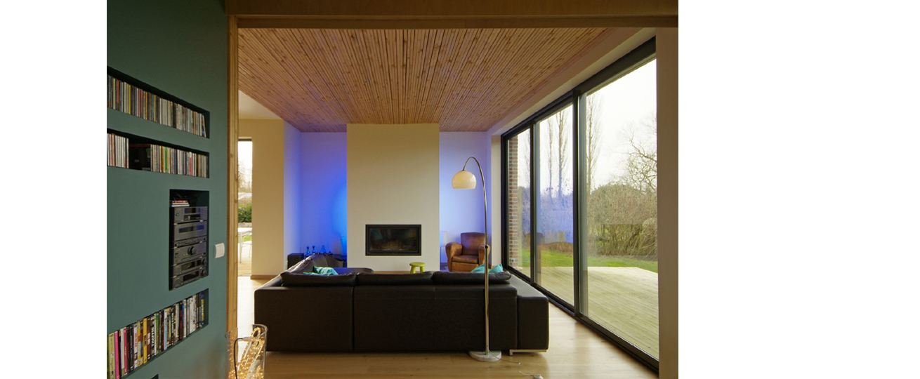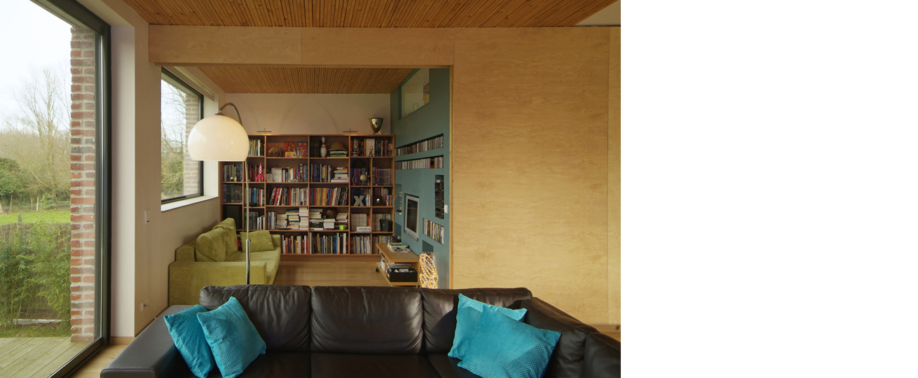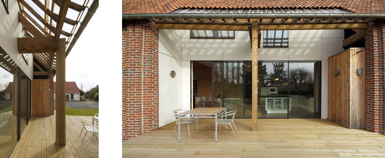 Sur le versant nord, en limite de propriété, une verrière a été installée permettant d’éclairer le car-port, l’entrée et le boudoir ainsi que la circulation des chambres. Le pignon ouest, partie la plus abîmée de la grange, a, quant à lui, été reménié sans basculer dans le faux-semblant. Une grande baie éclaire le salon et un jeu de brique existante, bardage et béton compose cette intervention.