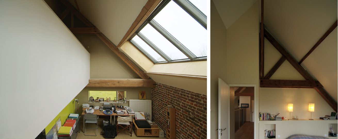 Plutôt que d’ouvrir chaque pièce sur l’extérieur, une seule et grande ouverture permet d’éclairer plusieurs pièces. Ainsi, un pan de mur a été entièrement démonté entre deux fermes de charpente et permet d’éclairer la cuisine, le séjour et 2 chambres. Cela a permis sur ces 2 travées de faire apparaître la boîte ‘habitation’ et sa façade par rapport à la peau de brique.