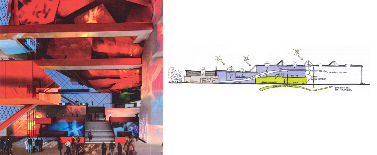 L'aménagement intérieur s'organise donc autour d'une dalle surélevée, ajourée permettant à la lumière de pénétrer jusqu’au rez de chaussée. Véritable espace central de circulation, c'est une rue surdimensionnée qui traverse le bâtiment, espace baigné de lumière, épine dorsale, lieu de rencontre et d'échange.